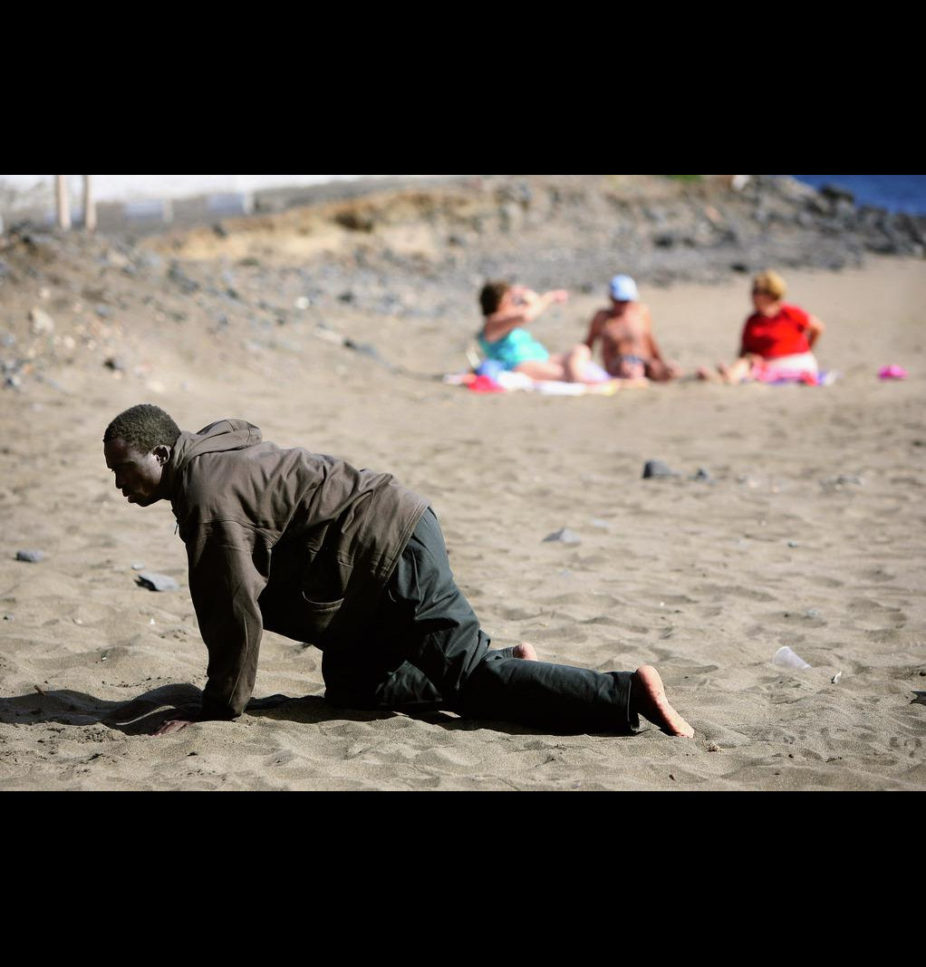 Sur une plage méditerranéenne ensoleillée, le temps semble figé. Un homme noir, à bout de force, rampe péniblement pour quitter la plage.