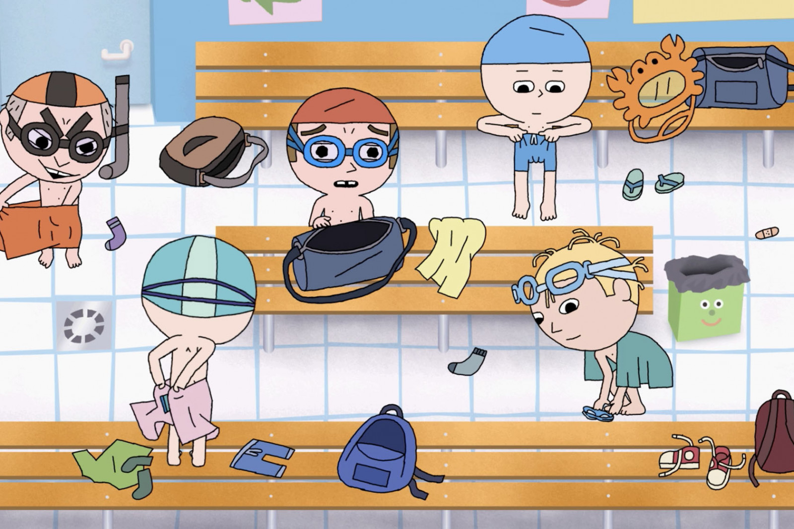 Antoine découvre dans le vestiaire qu’il a oublié son maillot de bain. Le cours de natation commence, il faut qu’il trouve une solution.