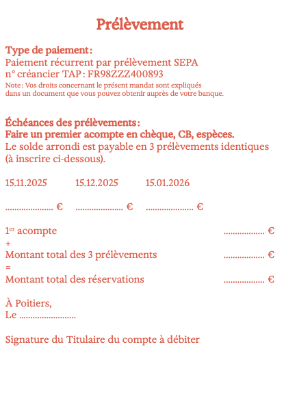 - Facilités de paiement : mandat de prélèvement disponible à l’accueil, dans le bulletin de réservation et téléchargeable ici, IBAN indispensable.