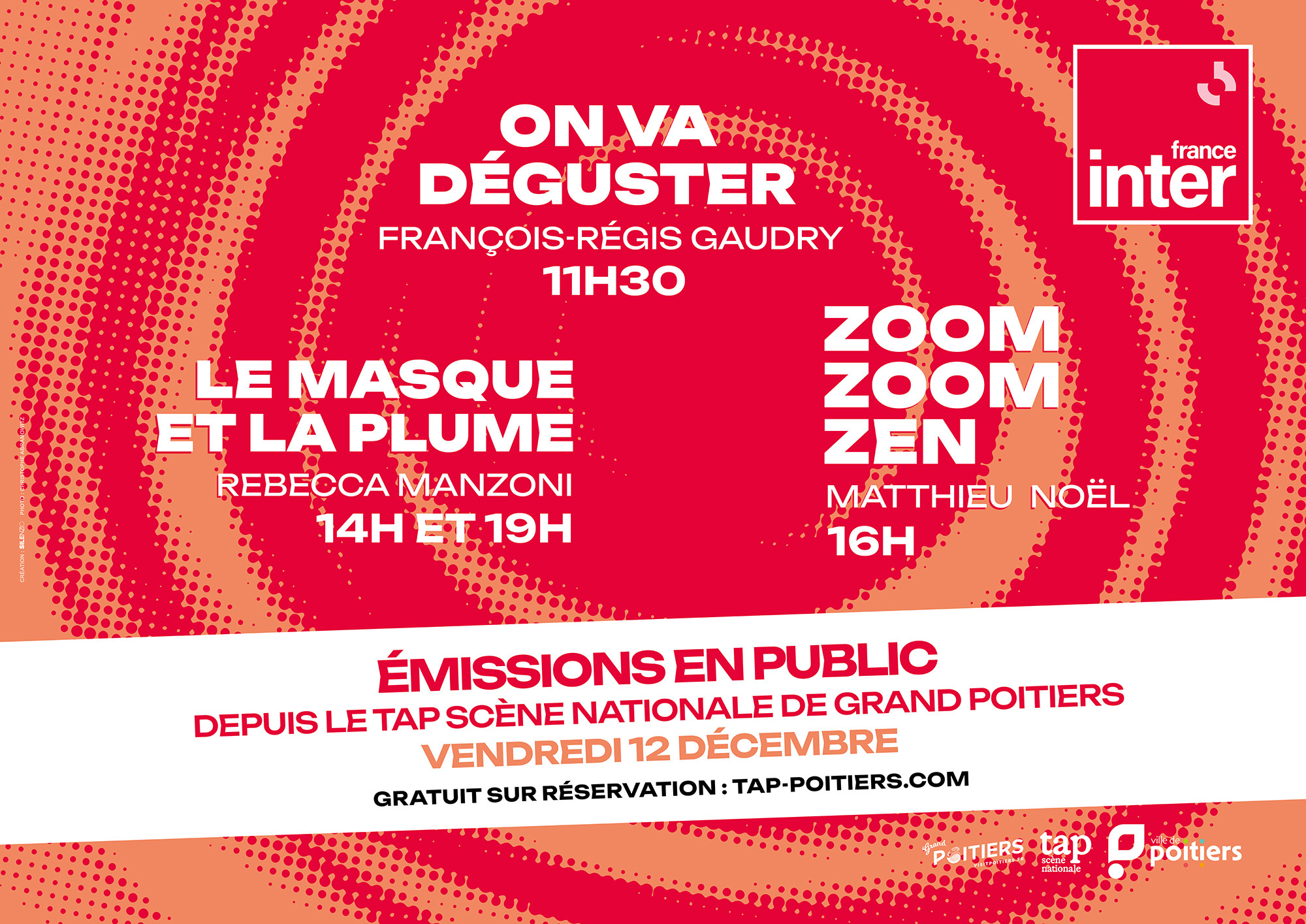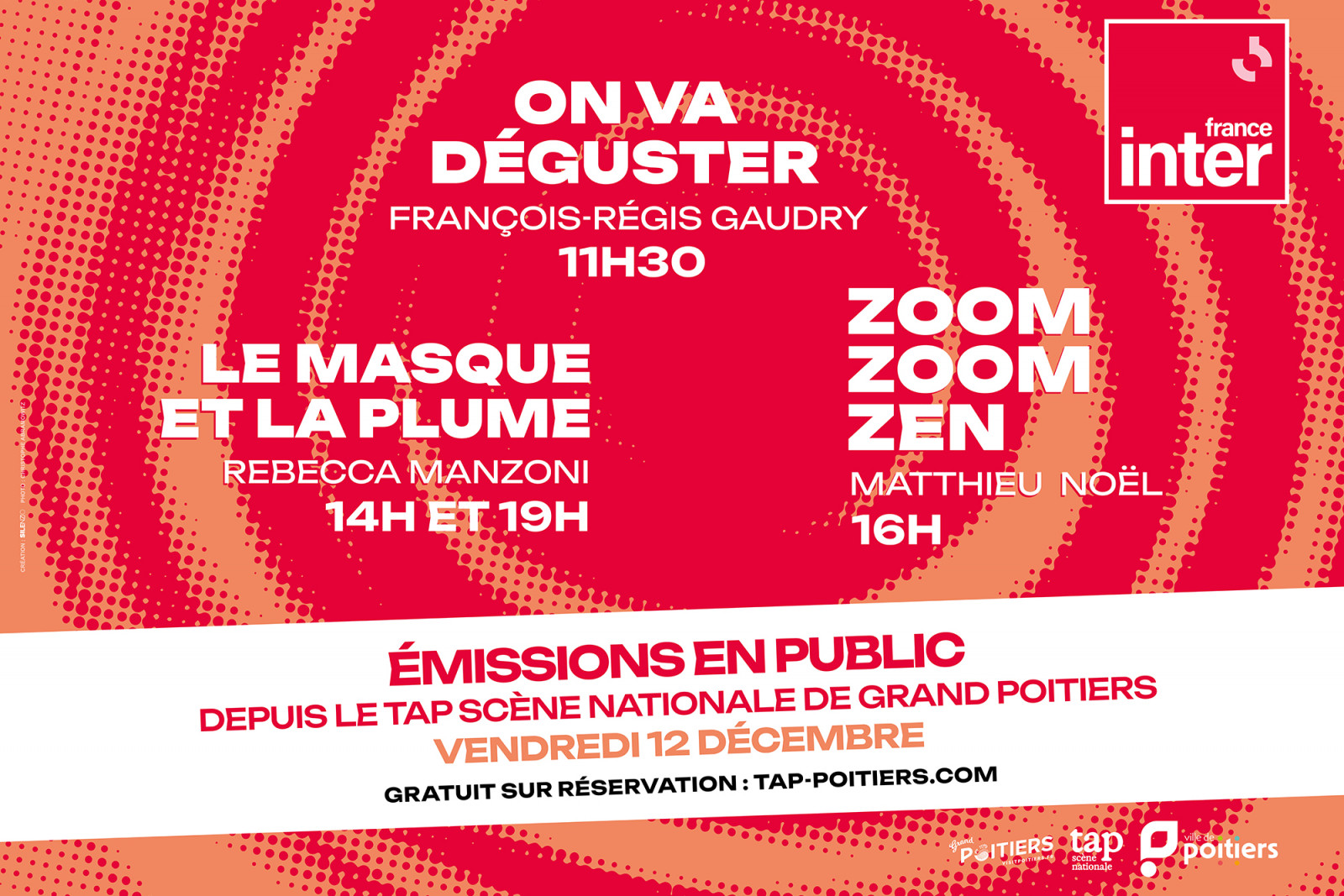 France inter – Émissions en public France inter est de retour au TAP avec 4 émissions emblématiques en public. Programme On va déguster François-Régis Gaudry 12 décembre 2025 Le Masque et la Plume – Livres Rebecca Manzoni 12 décembre 2025 Zoom Zoom Zen Matthieu Noël 12 décembre 2025 Le Masque et la Plume – Cinéma Rebecca Manzoni 12 décembre 2025