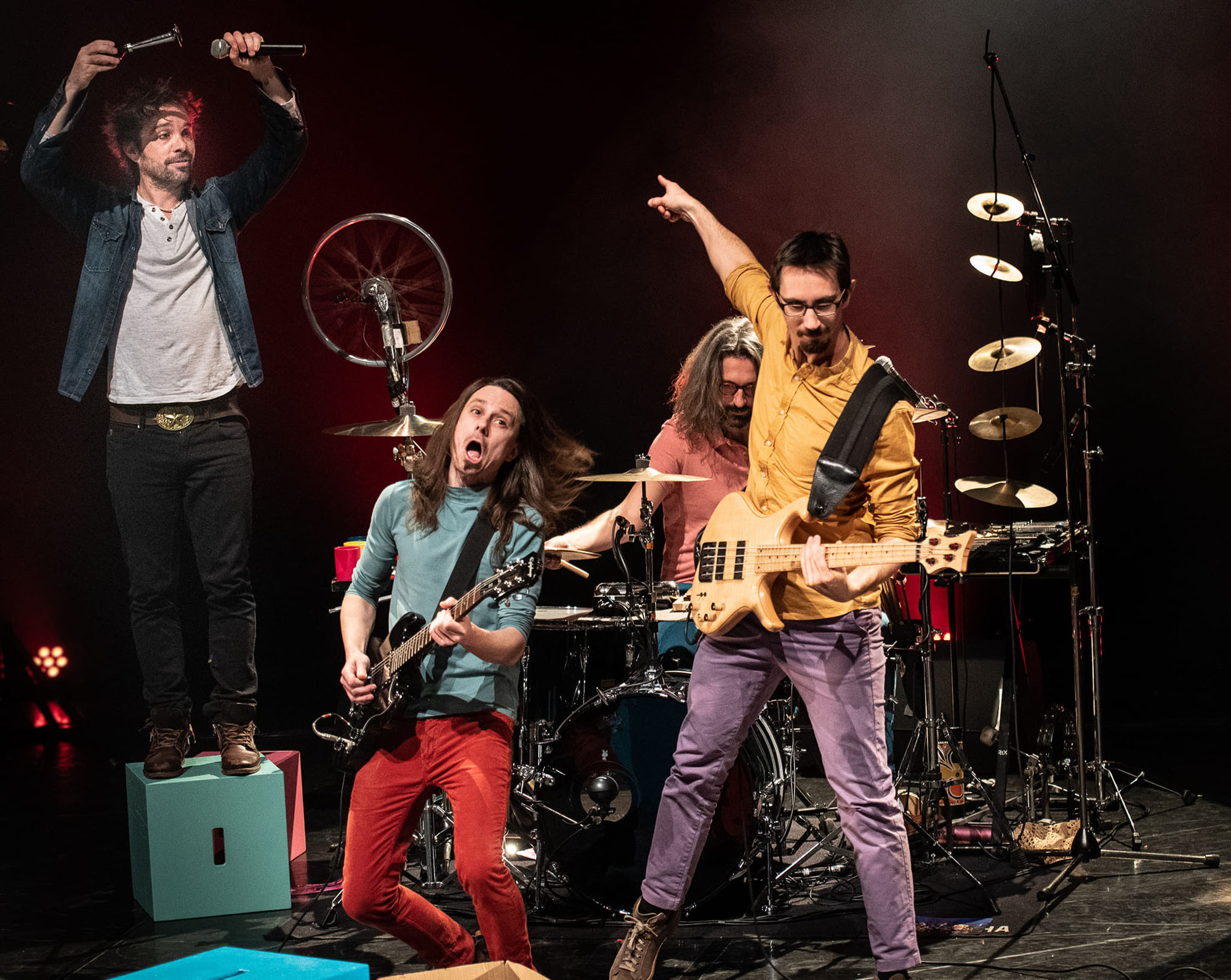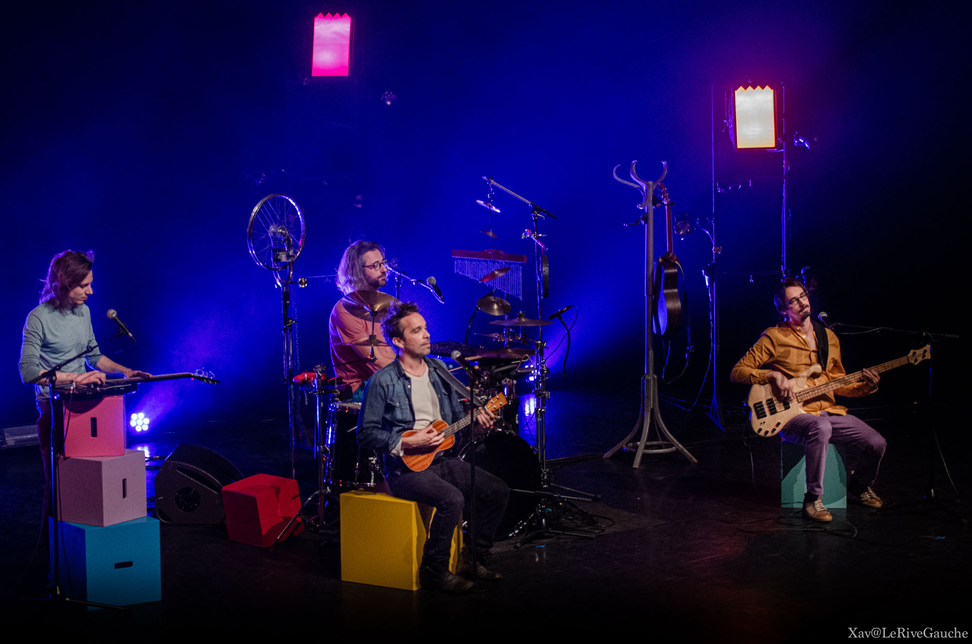 « Bienvenue dans mon antre à chansons » ! Ainsi commence le concert kids friendly de ces rockeurs aux sous-pulls acidulés, adultes (et déjà parents), ravis de retomber en enfance. L’ogre c’est lui, Ben Herbert Larue, chanteur normand au verbe gouailleur et à la voix trrrrrrès grave. Pas effrayant pour autant, il chronique la vie des bambins à la manière espiègle d’un chansonnier ravi de se moquer des grands. Ça donne, dans le désordre, un Pue du bec qui ne se lave jamais les dents, des dictons de grand-mère, une ambiance western avec cheval hennissant ou un détournement de pierre-feuille-ciseaux. La bande n’a aucun problème à mélanger gargarismes, chansons douces et riffs rock acérés. Du moment que tout le monde est prêt à « faire la fête, la bamboche, le tintamarre » comme le claironne leur tube. Les enfants, c’est l’heure de vivre votre premier concert de rock !