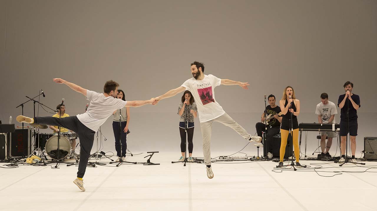 C’est une répétition, qui vire vite à la folie. Pierre Rigal entremêle danse, chant, théâtre et musique dans une sorte de laboratoire burlesque sur le même et le différent, sur l’identité et l’évidence. Il met en jeux les multiples sens – et paradoxes – du mot : le même est-il absolument le même ? Sur scène, les actions répétitives deviennent des boucles décalées, des gags drolatiques. Avec la musique pop et rock de son groupe MicroRéalités jouée en direct, les artistes polyvalents – parmi eux le Poitevin Malik Djoudi [au TAP en février] – s’assemblent, s’opposent et s’empêtrent dans un joyeux bazar surréaliste.