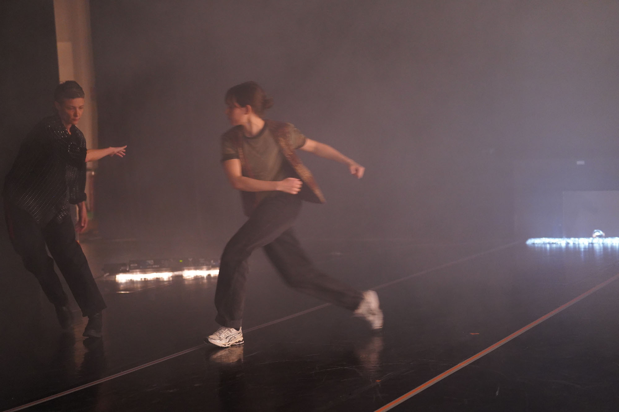 Une guitare posée à terre, qu’un pied irrite, donne le ton. Partager le vide sera la rencontre très électrique entre deux danseuses au vécu et aux âges différents, la jeune Sophia Dinkel et l’expérimentée Marie Goudot, croisées chez Anne Teresa de Keersmaeker. Dans une posture postpunk, elles semblent faire table rase de leur passé d’interprètes et poser les bases d’une relation nouvelle, imprévisible et sauvage. S’accorder passe par des retrouvailles gestuelles en écho, des éloignements solitaires, des prises de micro, des coulées douces à terre et des cordes triturées sans manière. À la fois concert mouvant et danse sonore.