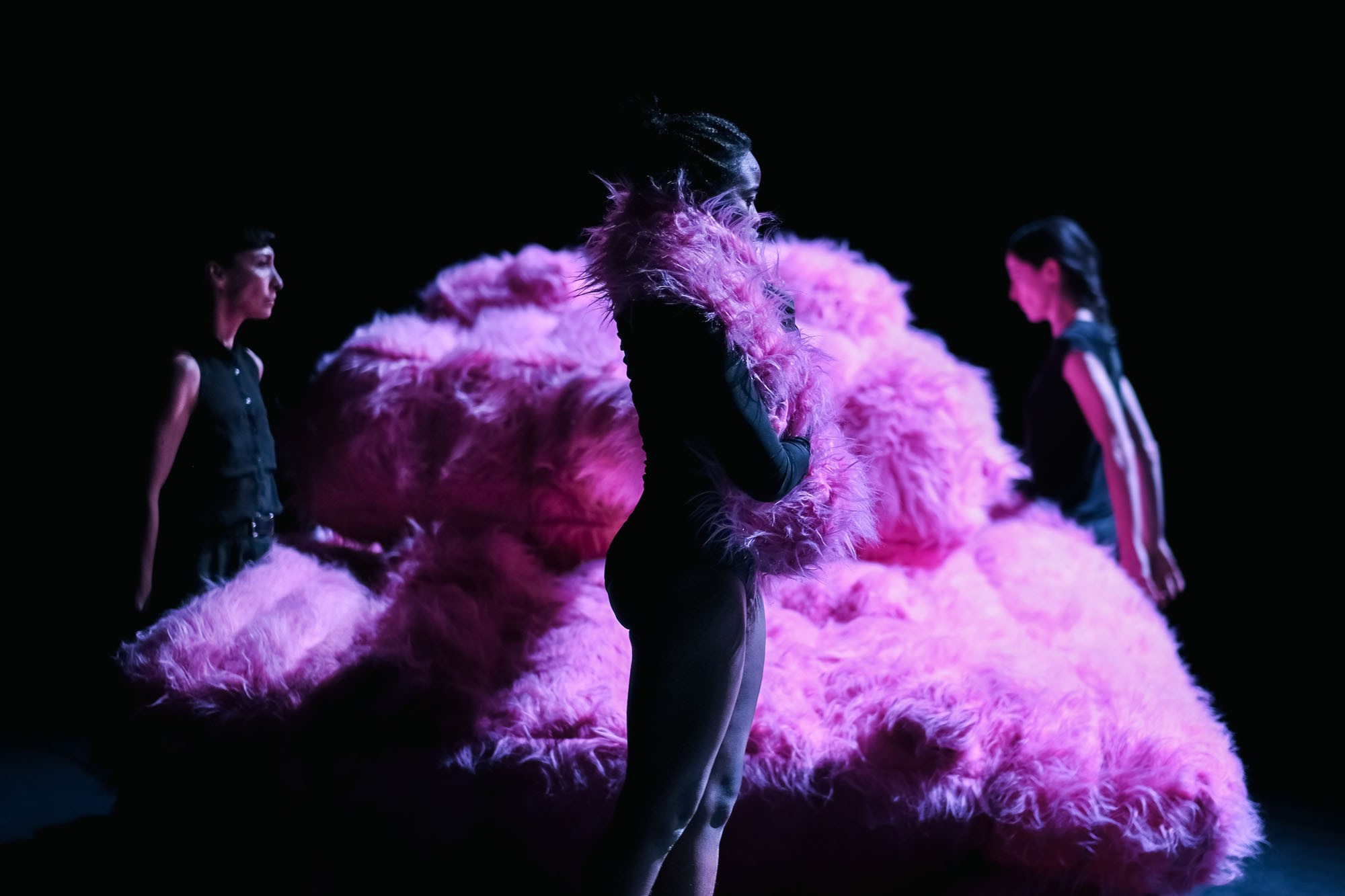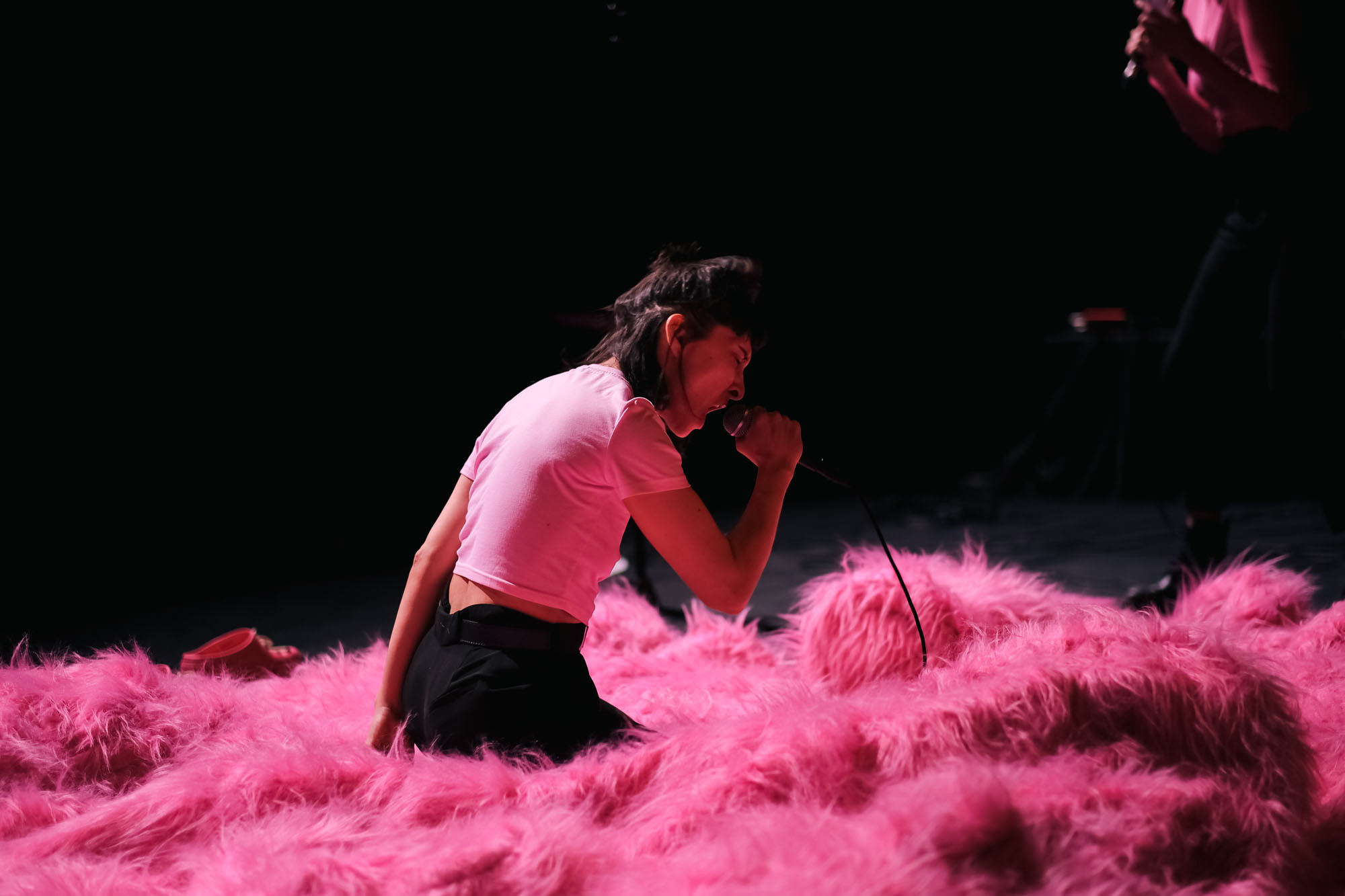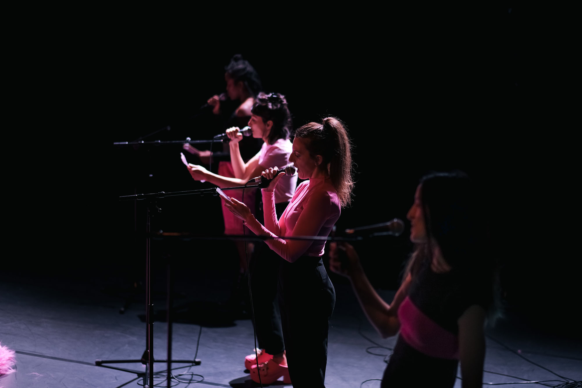 Rose sera leur couleur. Pas celle des petites filles sages, non. Celle d’un soulèvement punk, queer et tapageur, sorte d’oratorio incantatoire pour cinq voix féminines, entourées par le public. Leurs armes ? Des micros et une œuvre plastique (A Shy Girl) en forme de char d’assaut gonflable, rose et velu, conçue par l’artiste chinois Xinhan Yú. Tout sauf timides, ces danseuses-chanteuses-comédiennes (dont une soprano) se font lascives sur la fourrure, combatives dans leur litanie de mots scandés, susurrés, rappés, chantés. Le duo rochelais Sine Qua Non Art (Christophe Béranger et Jonathan Pranlas-Descours) signe une nouvelle performance hybride et immersive, au casting pour la première fois 100 % féminin.